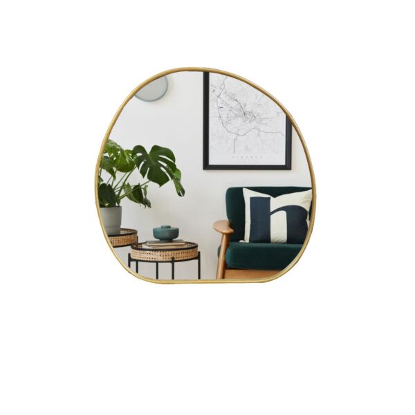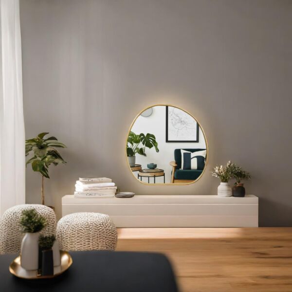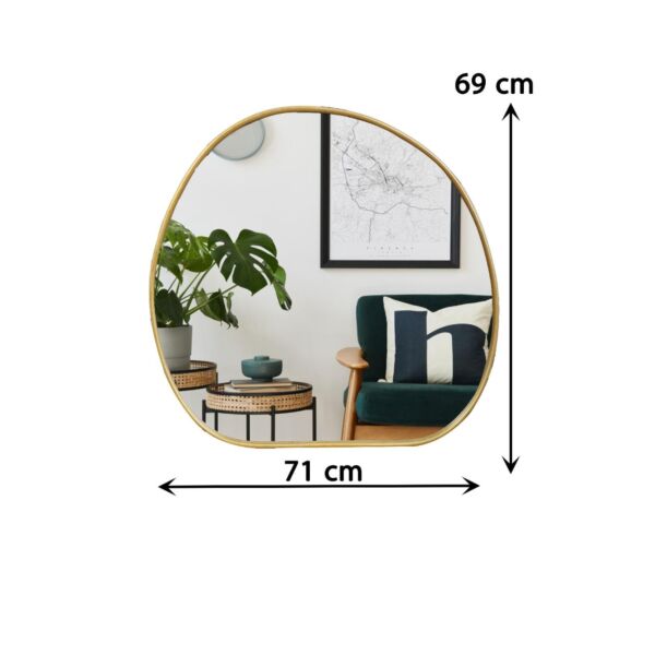 مرآة حائظ موديرن بإطار حديد لون ذهبي مع تفاصيل مميزة تجمع بين التصميم العصري والجودة العالية لإضفاء لمسة أنيقة على المساحة المعيشية في منزلك.