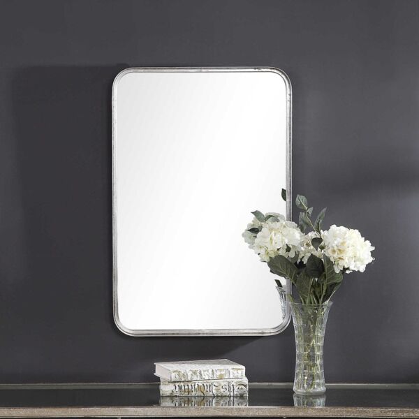 مصنوعة يدويًا من إطار معدني بحواف دائرية وحافة داخلية، تتميز هذه المرآة الكبيرة بتصميمها الفريد من نوعه. يمكن تعليقها أفقيًا أو رأسيًا لتتناسب مع أي مساحة. يأتي الإطار بتشطيب أوراق فضية مصقولة، مما يضفي عليها لمسة من الأناقة الكلاسيكية. الأبعاد: 50.8 سم ارتفاعًا × 5.84454 سم عرضًا × 76.2 سم عمقًا المادة: إطار معدني بتشطيب أوراق فضية مصقولة. اللون: فضي.